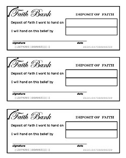 Download and print the activity below. Think of the beliefs that Sacred Scripture and Tradition teach us. These beliefs are the deposit of faith. You participate in the faithful handing on of the deposit of faith. Complete the “Deposit of Faith” slips to tell about the beliefs you want to hand on and how you will hand them on. Cut them out and keep them as a reminder of the sacred trust you share to pass on the Good News.